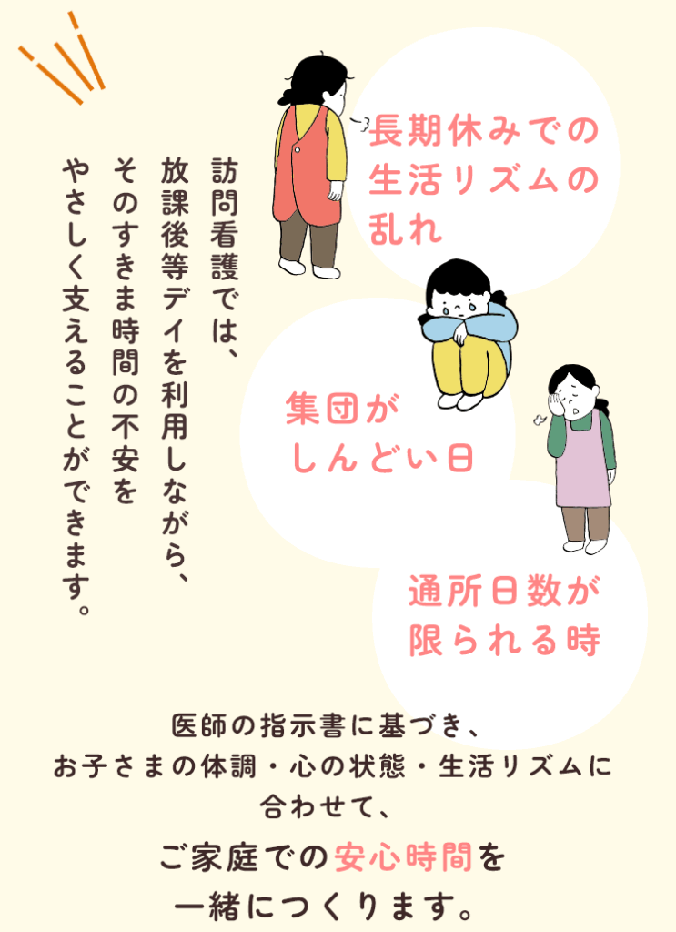 放課後等デイサービスと併用するご家庭を、 訪問看護が“やさしく補完”します。